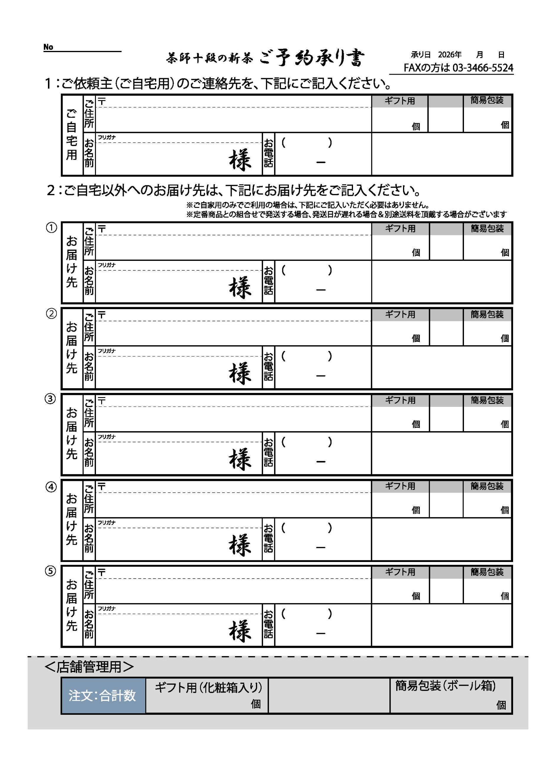 ご来店いただき、新茶予約希望とお伝えください。申込用紙をご用意しておりますので、ご記入ください(下記からダウンロード可能です)。